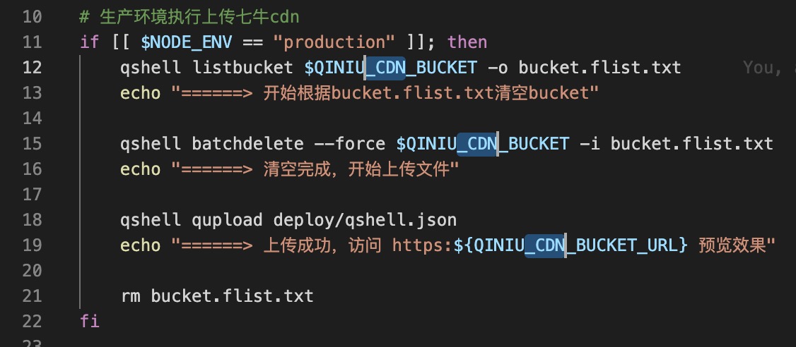 也就是在上传七牛云空间的这一步操作,发生了严重的错误,配置环境变量的时候忘记配置新的cdn bucket名,脚本在执行上传之前会全部清空一遍!而忘记配置的那个旧环境变量就是为了七牛上传静态文件的bucket😭