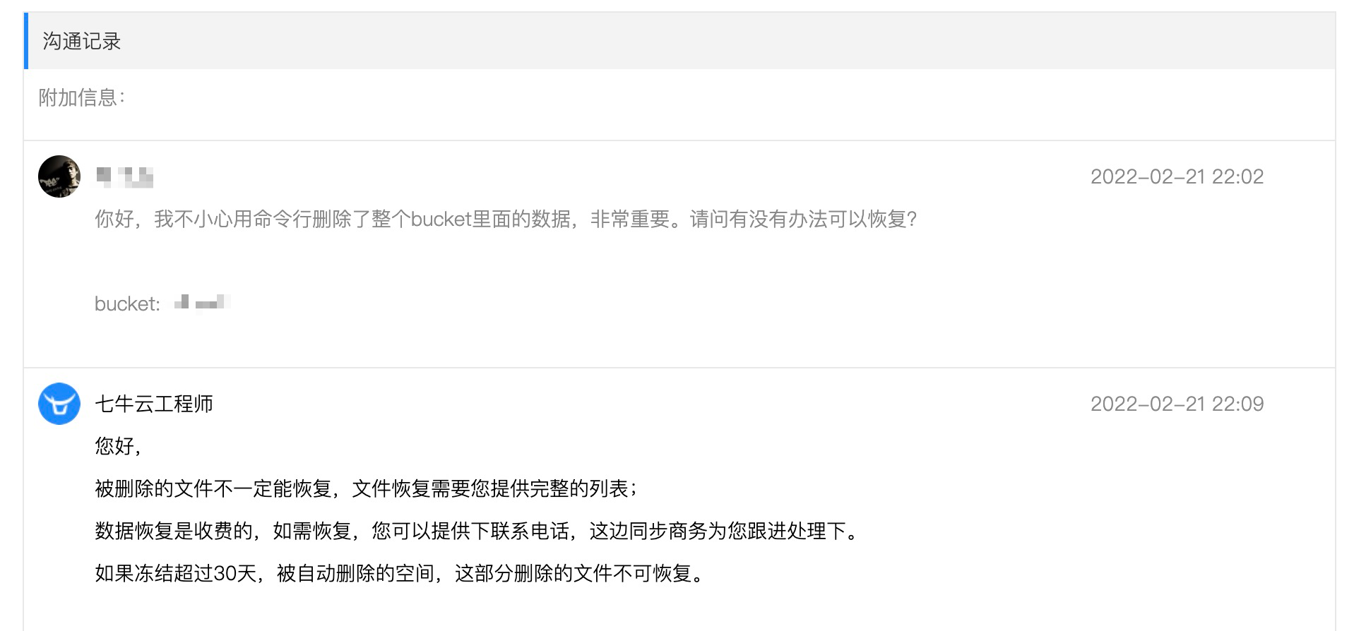 在意识到做了可能不可逆的操作后,第一时间想到提工单给七牛客服,试图说明情况是否可以恢复数据: